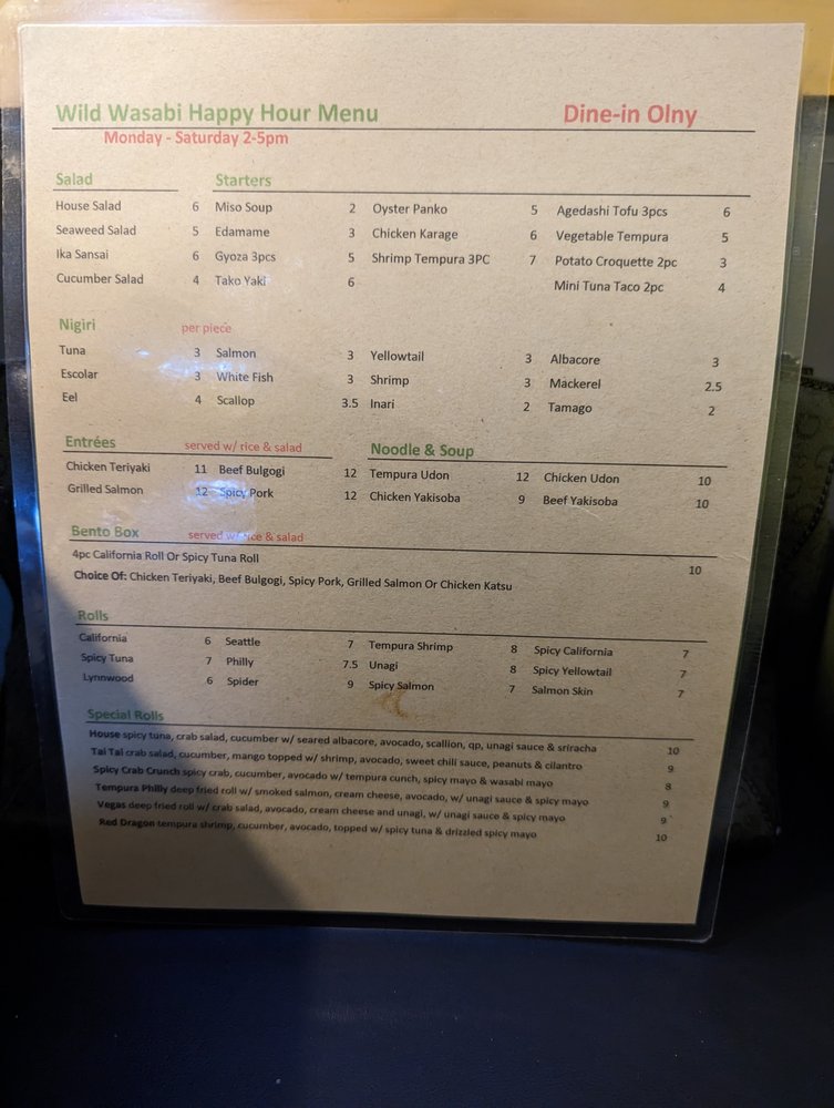Wild Wasabi Japanese Cuisine offers a diverse menu with options for both meat lovers and vegetarians. From their appetizers like Salmon Poke Salad and Gyoza Dumplings to their flavorful soups like Miso and Spicy Shiitake Mushroom, the restaurant promises a culinary experience that caters to various palates. Customers rave about the sushi rolls, highlighting favorites like the salmon lover roll and Toro nigiri. The ambiance is described as clean and well-staffed, making it a pleasant dining experience. Prices are reasonable, with specials to make it worth it. Whether you're a sushi enthusiast or looking to try Japanese cuisine, Wild Wasabi is a must-try in Lynnwood, WA.